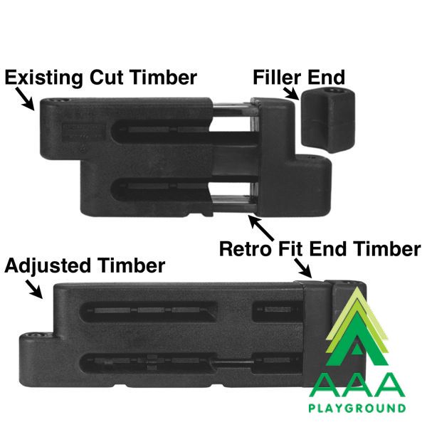 The Adjustable-Fit End System for Funtimbers is the ideal solution when one has an irregular area and the border must fit exactly. By using the Adjustable-Fit End System for Funtimbers, the playground perimeter can be customized. To use, simply cut the Funtimber to length and insert the Adjustable-Fit End System for Funtimbers to create the desired length. The Filler Ends will provide a finished appearance when the Funtimber abuts to existing walls or fences. The Adjustable-Fit End System for Funtimbers contains two (2) Retro-Fit Ends and two (2) Filler Ends for use with 8-inch, 9-inch, and 12-inch Funtimbers.