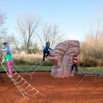 The AAA Playground Cascade Range Netted Boulders is the most challenging set of netted boulders that Everlast Climbing has to offer. It includes two medium (6’ tall) boulders and one large (8’ tall) boulders, all connected by a series of strong nets. By climbing up the rock faces and across the nets, kids can navigate the entire structure in one continuous adventure without ever touching the ground. Each net used in the structure is made from ropes with an extremely strong blend of steel and synthetic fibers with a protective nylon coating. They are easily strong enough to support multiple children at once, and each net has a unique design to provide varied climbing experiences. The boulders included in this set are hand painted with the rust sandstone coloration to imitate the appearance of natural outcroppings in a canyon or desert. The set is large enough and sturdy enough to be suitable for very large crowds of young adventurers.